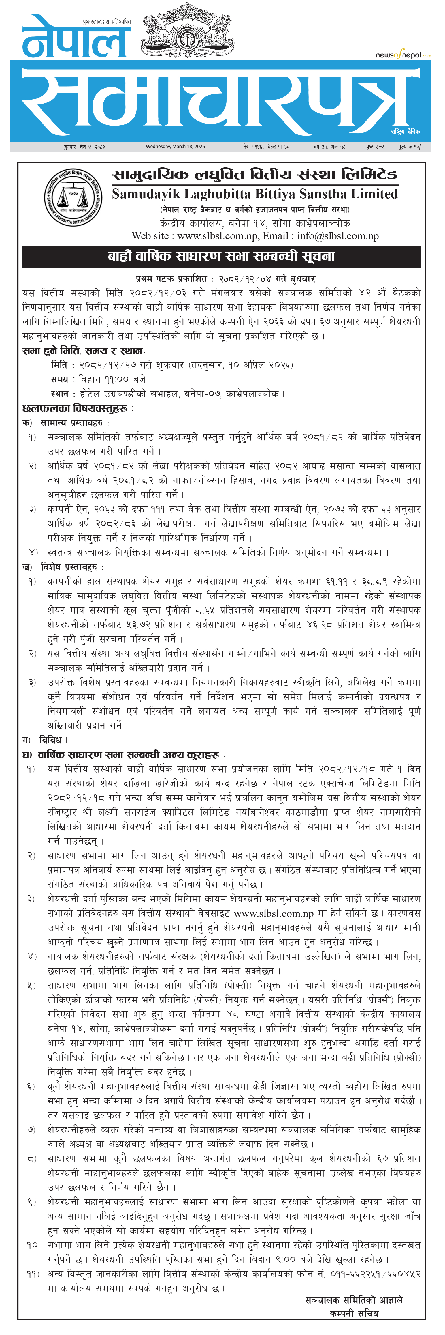 One of the Micro finance Institutions registered under the company Act, 2063 on 2070-03-28 as public limited Company having Registration number 114029/069/070 in Company Registrar Office, Kathmandu, Nepal and licensed by Nepal Rastra Bank (Central Bank of Nepal) as a 'D' class financial institution on 2070-12-30 with Reg. No. 36/070/071 to operate under bank and financial institution act 2073. We locate at Sanga, Banepa Municipality,ward no. 14,Kavrepalanchowk district,Province No. 3 of Nepal.